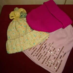 Kötött női sapkák, három darab, a sárga kézi kötésű. Jókai.