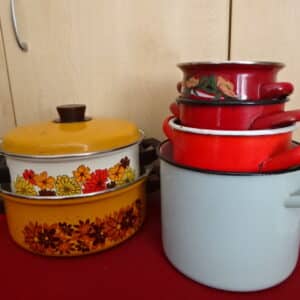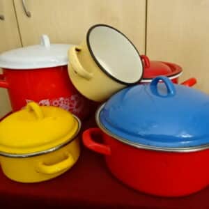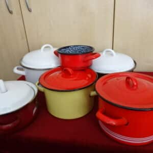 Zománcozott edények, lábos és fazék, hat darab fedővel. Jókai.