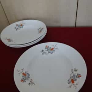 Alföldi porcelán kistányér, menza mintás (piros-kék-szürke csíkkal), öt darab egyben. Jókai.
