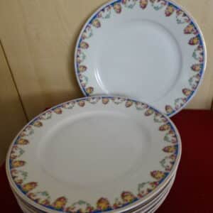 Alföldi porcelán süteményes tányér, menza mintás (piros-kék-szürke csíkkal). Hat darab egyben. Jókai.