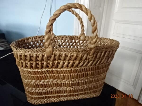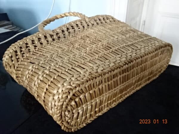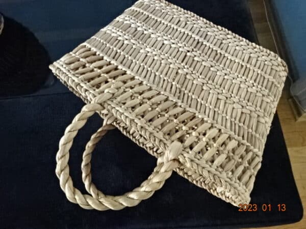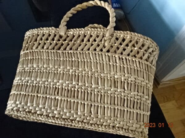 Kukorica héjból font szatyor, állapota új, nem volt használva, annak ellenére, hogy kb. 20 éves. Teljes magassága 40 cm. A kosárrész mérete: 44 x 27 x 12 cm.