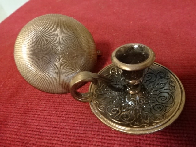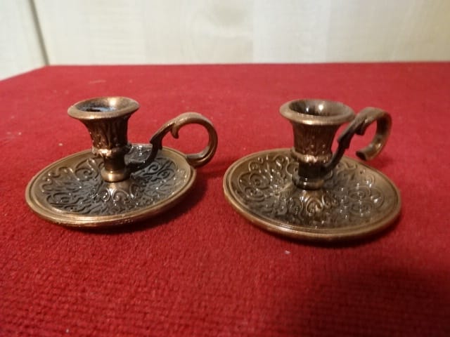 Bronz gyertyatartó, magassága 2,5 cm, alsó átmérője 5 cm. Két darab egyben eladó. Vékony gyertya fér bele.
