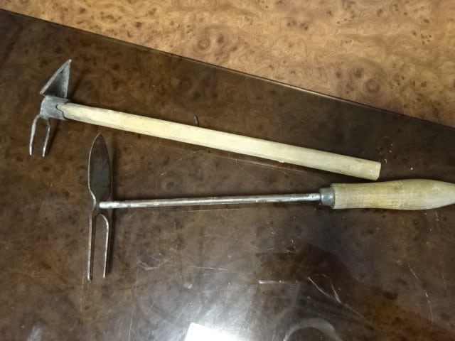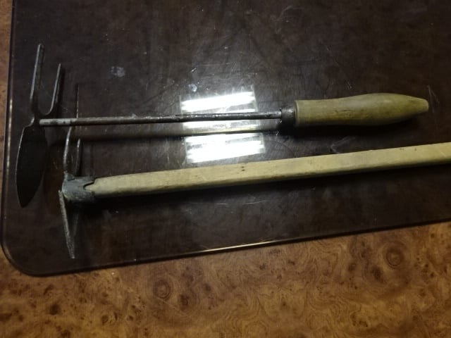 Kerti kiskapa, teljes hossza 35 és 36 cm. Két darab egyben eladó. Egyik vége kapa, a másik gereblye. Fa nyele van.