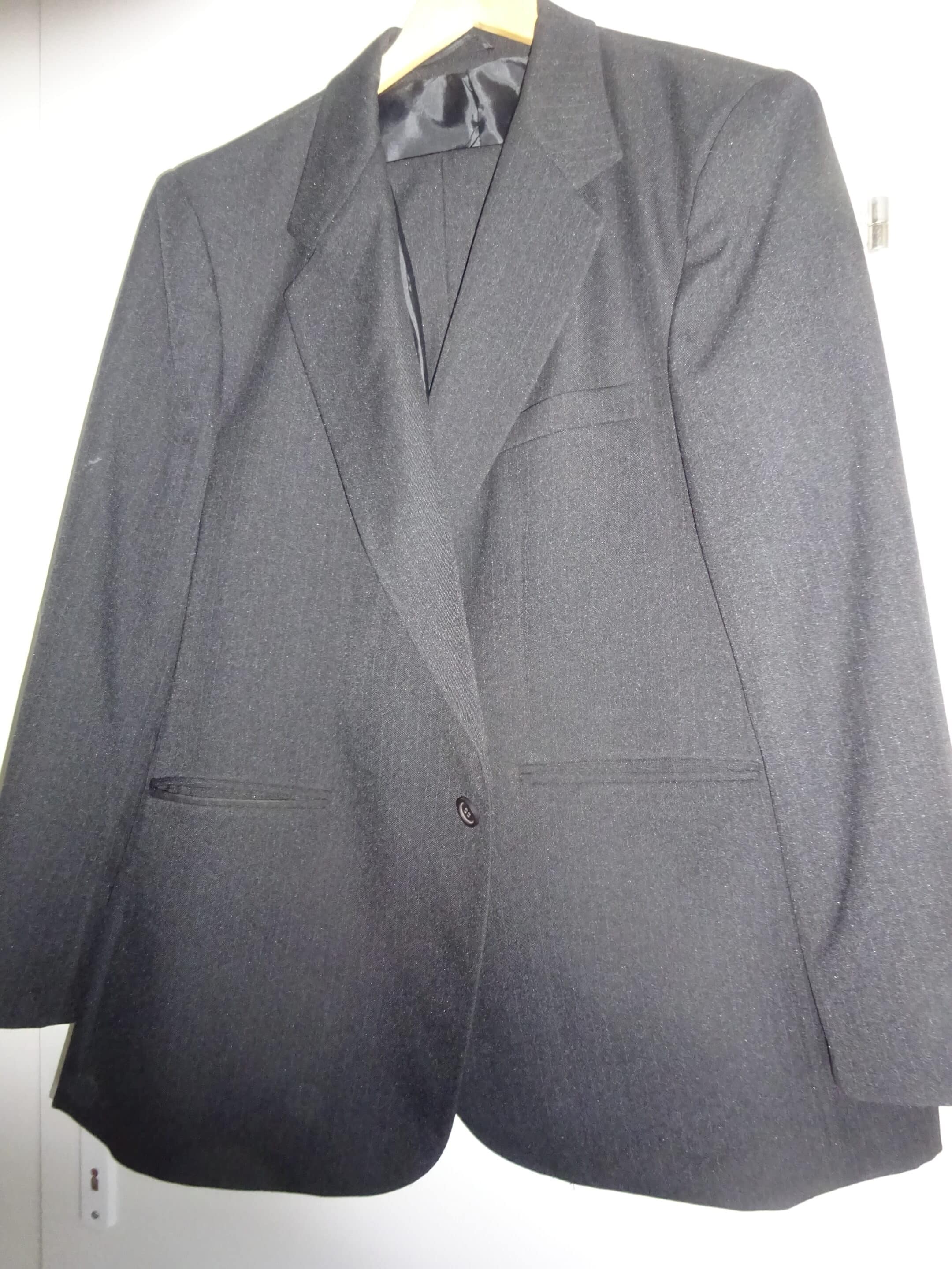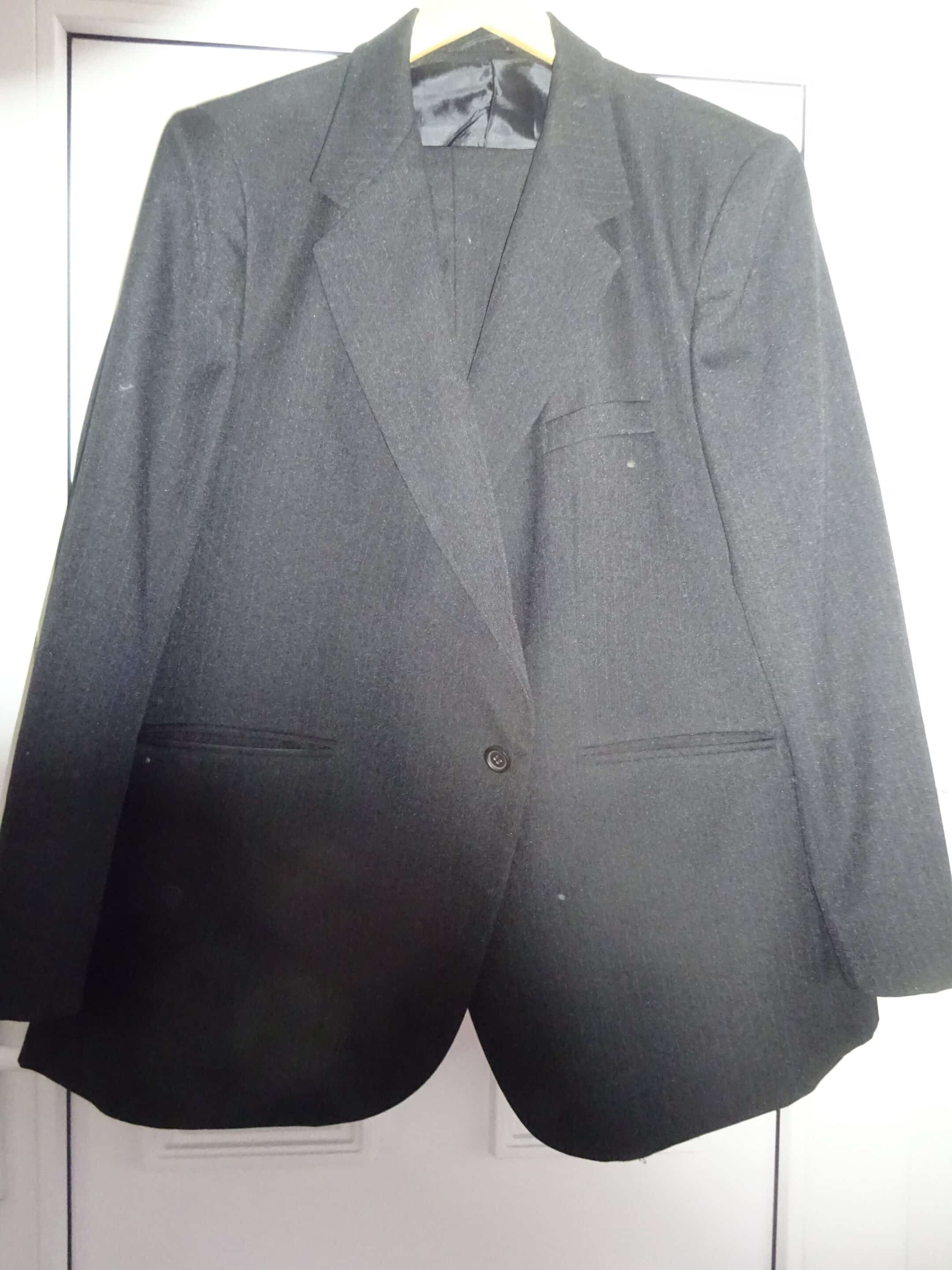 Férfi fekete öltöny, varratott, nagy méret. Állapota új, egyszer használt. A zakó vállszélessége 51 cm, hossza 85 cm. A nadrág derékbősége 134 cm, szárának külső hossza103 cm, míg a belső hossza 74 cm. Minőségi anyag. Kód: Edit