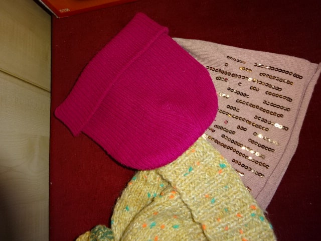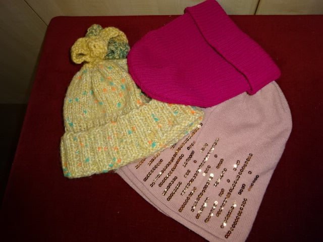 Kötött női sapkák, három darab. A sárga kézi kötésű.