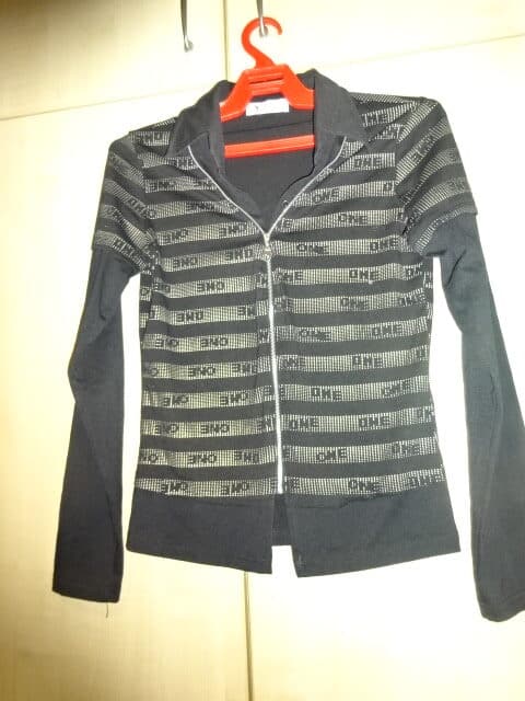 Alkalmi fekete – arany pulóver. A cimkén szereplő méret szerintem nem valós. A mellbősége 80 cm, persze nyúlik. Hossza 58 cm.