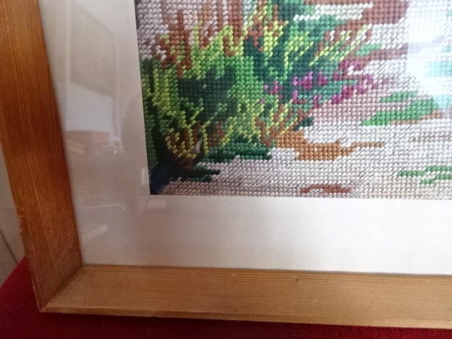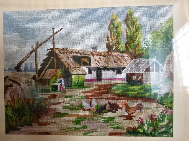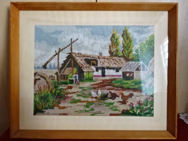 GOBELIN tájkép gémeskúttal, tyúkudvarral, fehér kartonpapír keretben, üveglappal fedett, hibátlan. Jókai.