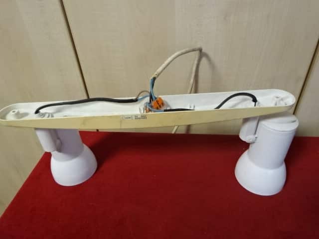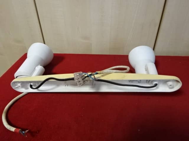 Kétkarú fali lámpa, szélessége 40 cm. Műanyag talp, fém búra.