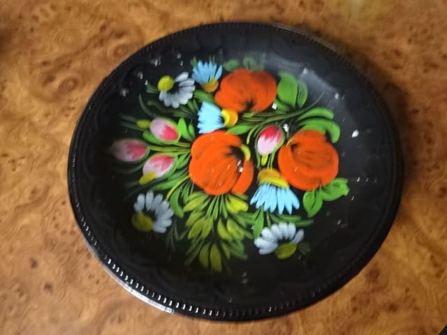 Gránit porcelán falitányér, kézzel festett, átmérője 24 cm. Kisebb kopások a virágoknál.
