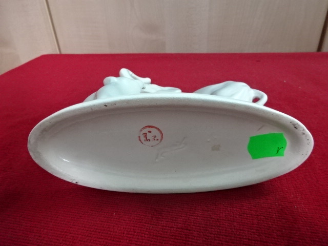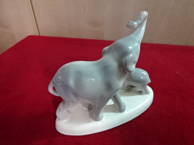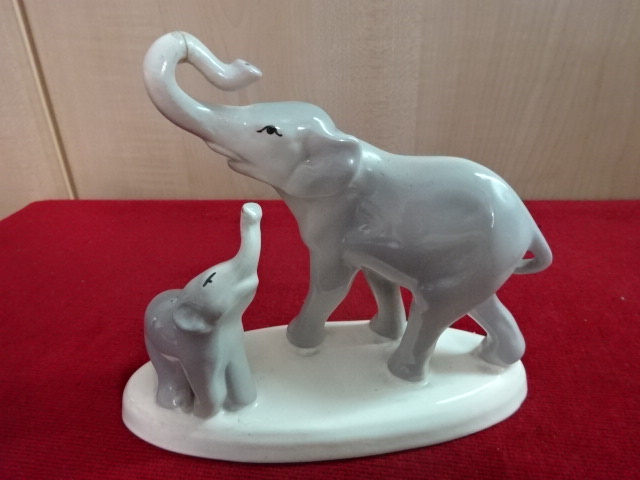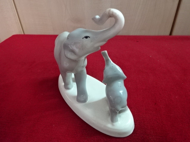 Gránit porcelán figura, anya elefánt és kicsinye. Hossza 15,5 cm, magassága 14 cm. A nagy elefánt ormánya javított. Kód: 300