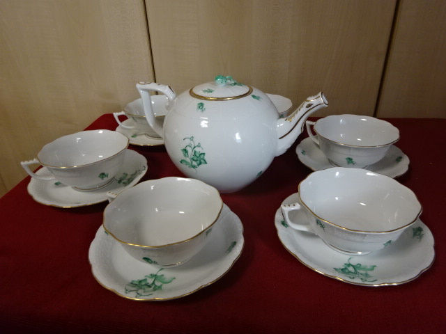 Herendi porcelán teáskészlet, Apponyi mintás, hatszemélyes, 13 darabos. Jókai