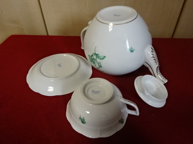 Herendi porcelán teáskészlet, Apponyi mintás, hatszemélyes, 13 darabos. Az alátét átmérője 14,5 cm. A csésze átmérője 10,5 cm, magassága 5 cm.