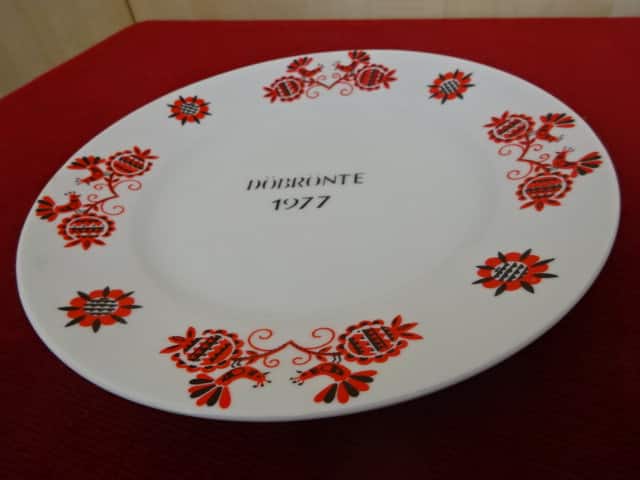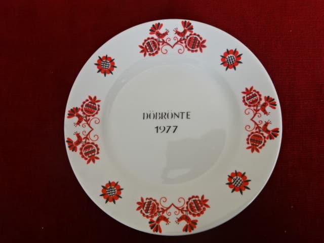 Hollóházi porcelán falitányér, Döbrönte 1977 felirattal, átmérője 18,3 cm.