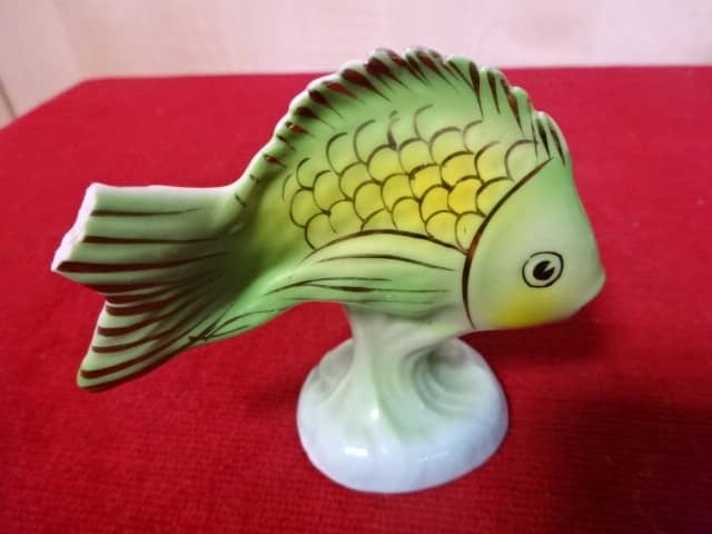 Hollóházi porcelán figura, kézzel festett hal /zöld-arany/, magassága 7,5 cm. Sajnos az egyik farka letölt.