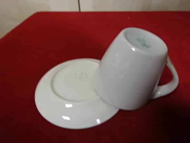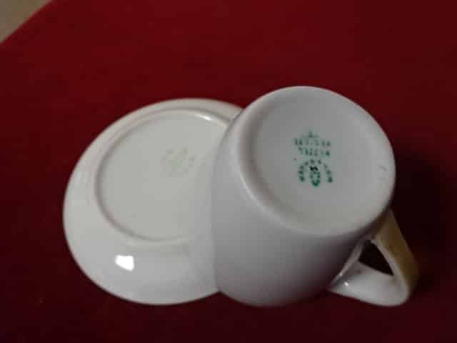 Hollóházi porcelán kávéscsésze + alátét, vajszínű, arany szegélyes, kézzel festett. Az alátét átmérője 9,5 cm. A csésze magassága 5,4 cm, átmérője 6 cm. Kód: 500