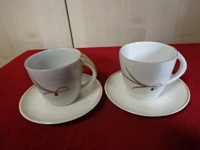 Hollóházi porcelán kávéscsésze + alátét, vajszínű, arany szegélyes, kézzel festett. Jókai