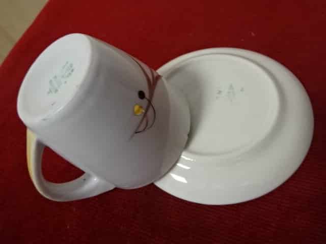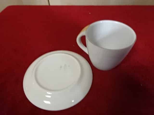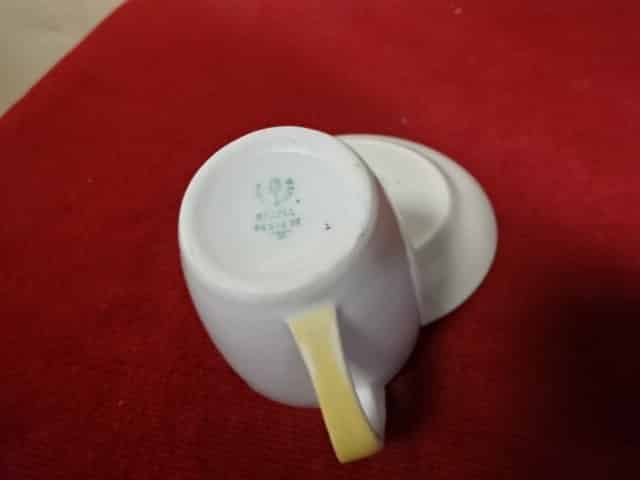 Hollóházi porcelán kávéscsésze + alátét, vajszínű, kézzel festett. Az alátét átmérője 9,5 cm. A csésze magassága 5,4 cm, átmérője 6 cm. A csésze felső peremén van egy lepattanás.