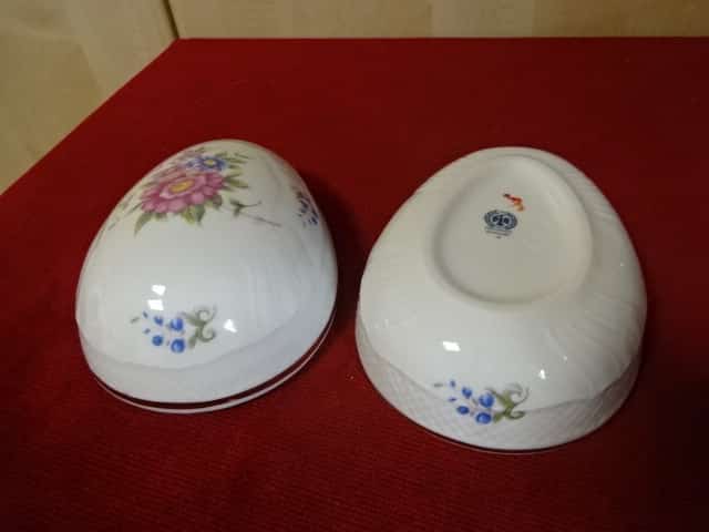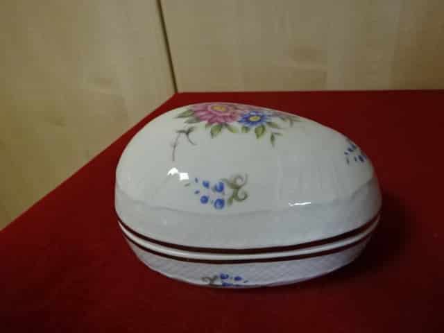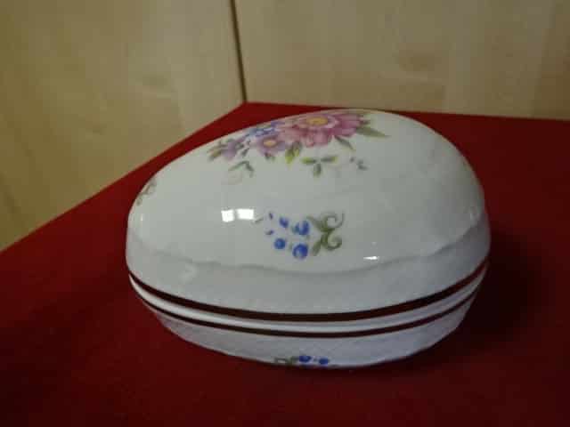Hollóházi porcelán, tojás formájú bonbonier. Hossza 13 cm, magassága 8 cm. Gyönyörű, virtinben tartott darab.