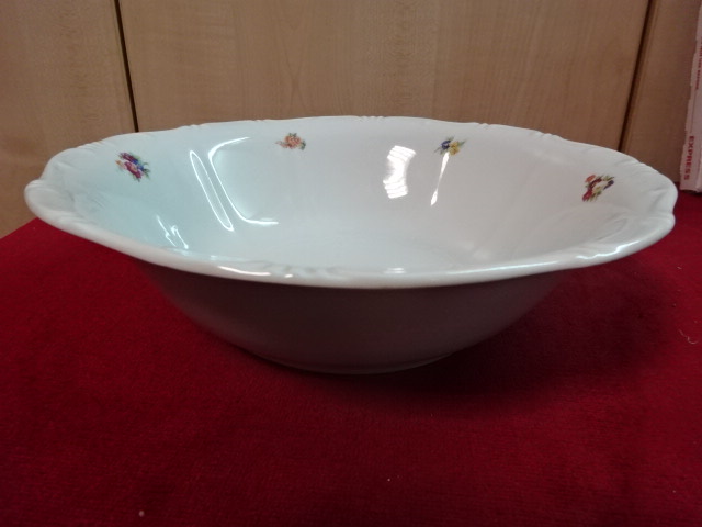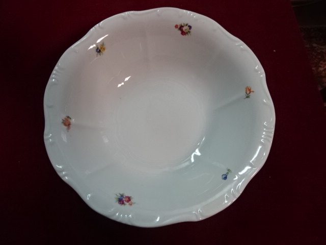 Zsolnay porcelán kerek köretes tál, antik, pajzspecsétes, átmérője 25 cm, magassága 7 cm. Vitrinben tartott darab.