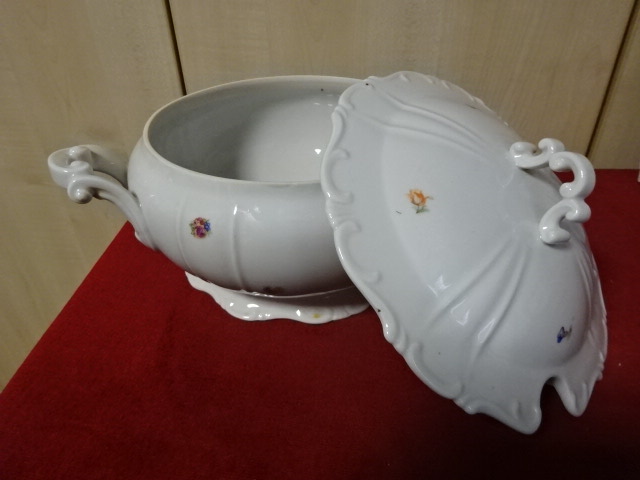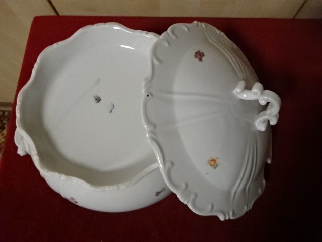 Zsolnay porcelán leveses tál, antik, pajzspecsétes, legnagyobb átmérője a tetőnek 23 cm. Vitrinben tartott darab.