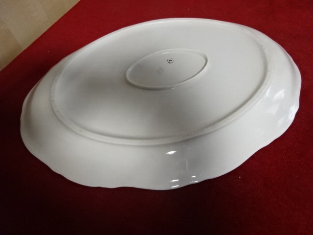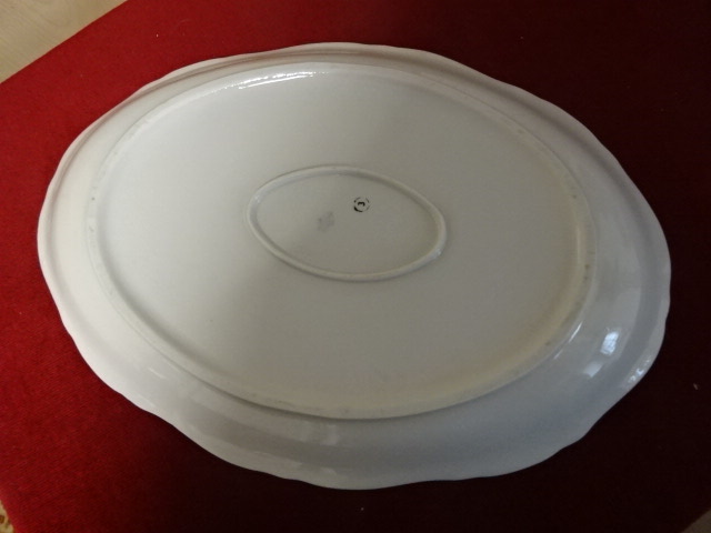 Zsolnay porcelán ovális húsos tál, antik, pajzspecsétes. Mérete: 37 x 26,5 x 3,5 cm. Vitrinben tartott darab.