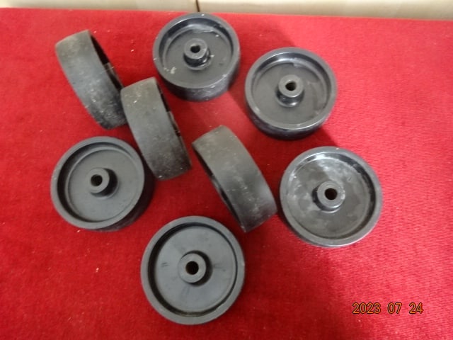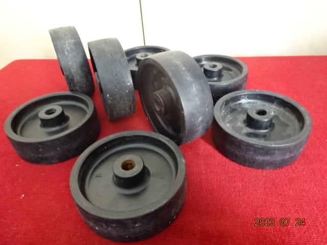 Polipropilén műanyag, kemény kerék, külső átmérője 9,5 cm. A kerék szélessége 3,3 cm. Belső furat átmérője 1,2 cm.