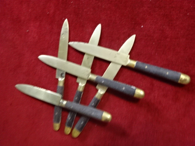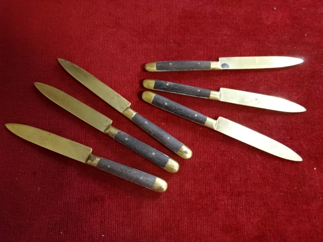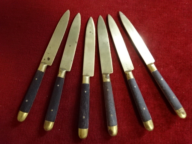 Sárgaréz deszertes késkészlet, hat darabos, hossza 15,5 cm.