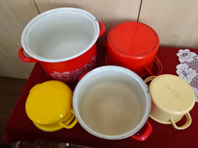 Zománcozott edények, lábos és fazék, többnyired fedővel, bár színben más lehet. Öt darab egyben eladó. Méretek: 8-3,5-3,5-1,2-1,2 literes. Kód: 500