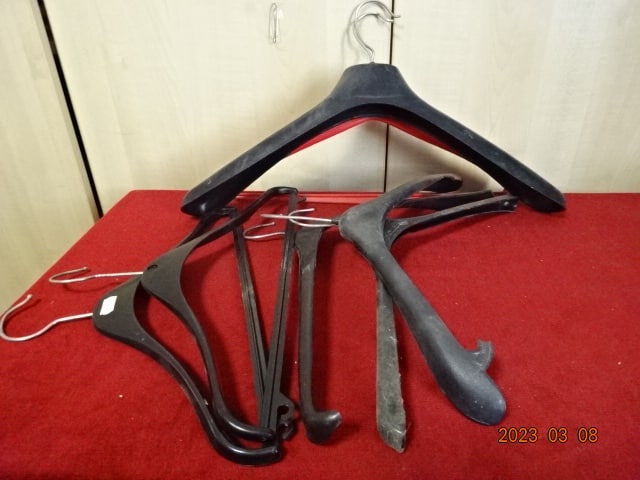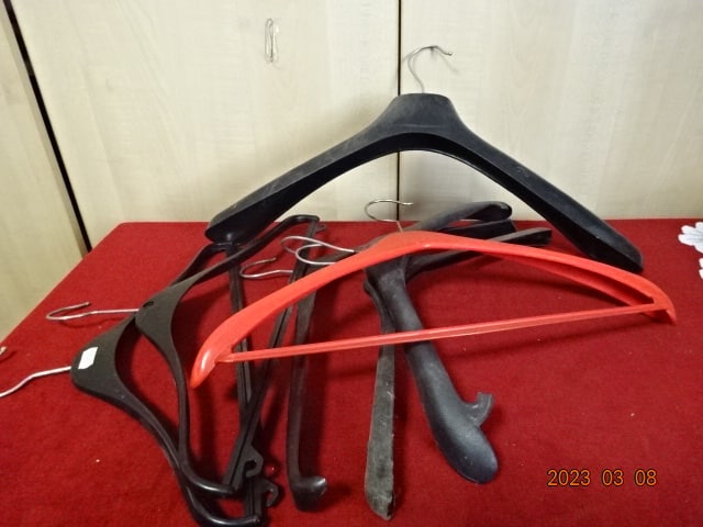 Műanyag ruhafogas, kabátok, zakók tárolására, vastag, erős. Tíz darab, fekete – fehér- piros. Kód: 0