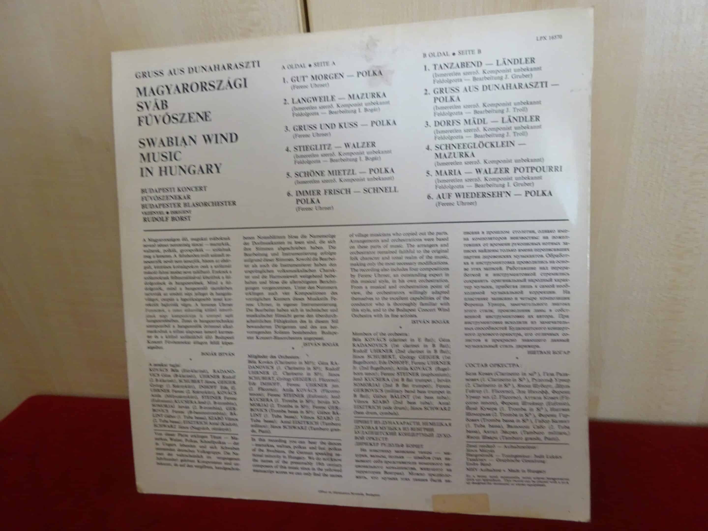VINYL nagylemez, HUNGAROTON LPX 16570, STEREO-MONO. Magyarországi sváb fúvószene – Grusz aus Dunaharaszti.