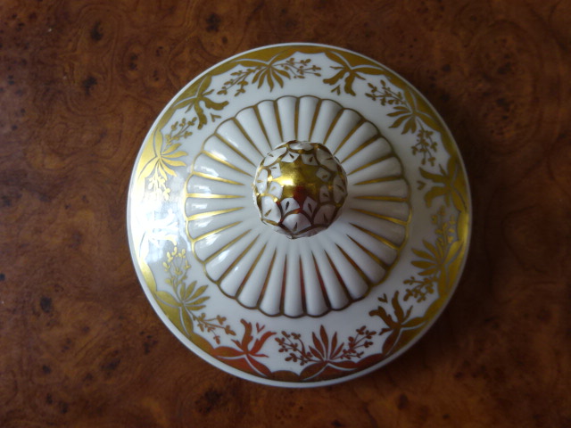 Német porcelán, bonbonier fedő, belső átmérője 10,5 cm. Dúsan aranyozott.