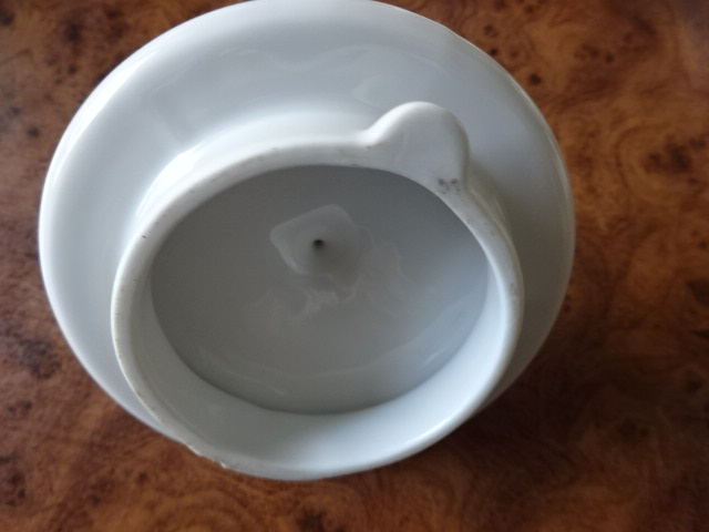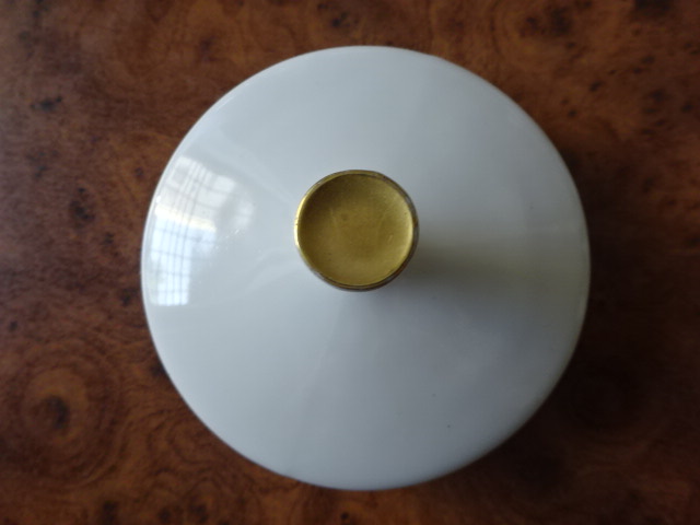 Porcelán kávéskanna fedő, fehér – arany végű fogóval, külső átmérője 9 cm. Jókai