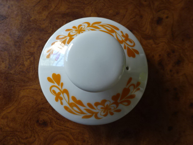 Porcelán teáskanna (kávéskanna) fedő, barna népművészeti mintával. Külső átmérője 8,7 cm, belső átmérője 6,7 cm. Hibátlan.