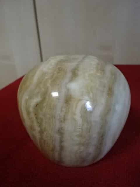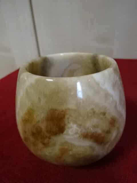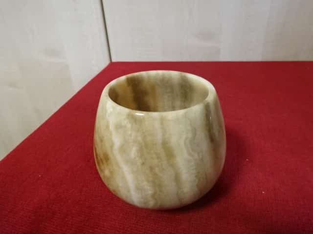 Márvány gyertyatartó, állapota új. Magassága 7,5 cm, legnagyobb átmérője 8 cm.