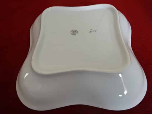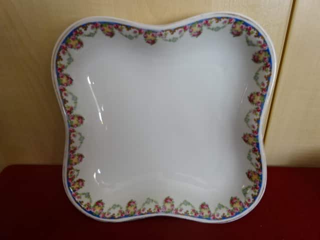 H & & csehszlovák porcelán, antik, négyszögletes köretes tál, rózsa mintás. Mérete: 22,5 x 22,5 x 5 cm. Állapota új, eddig még nem volt használva, vitrinben tartott darab.