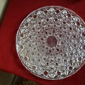 zöld üveg asztalközép, áttört mintával, vitrinben tartott, szép esztétikus, ajándék is lehet