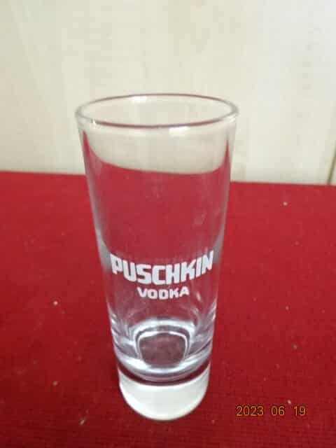 Vastag talpú pálinkás kupica, PUSCHKIN VODKA felirattal, magassága 10,5 cm, átmérője 3,7 cm.